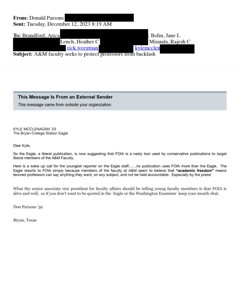 A local newspaper, The Bryan-College Station Eagle, wrote about the Faculty Senate meeting, which prompted an email from Donald L. Parsons, who has a reputation on campus as a vocal alumnus. Records obtained by The Chronicle illustrate his engagement, too.